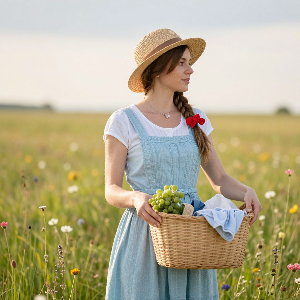 Woman wearing a straw hat and a light blue pinafore dress stands in a sunlit meadow, holding a woven basket filled with fresh laundry, her braided hair tied with a red ribbon and a delicate necklace adorning her neck, surrounded by lush green grass and blooming wildflowers under a serene sky.