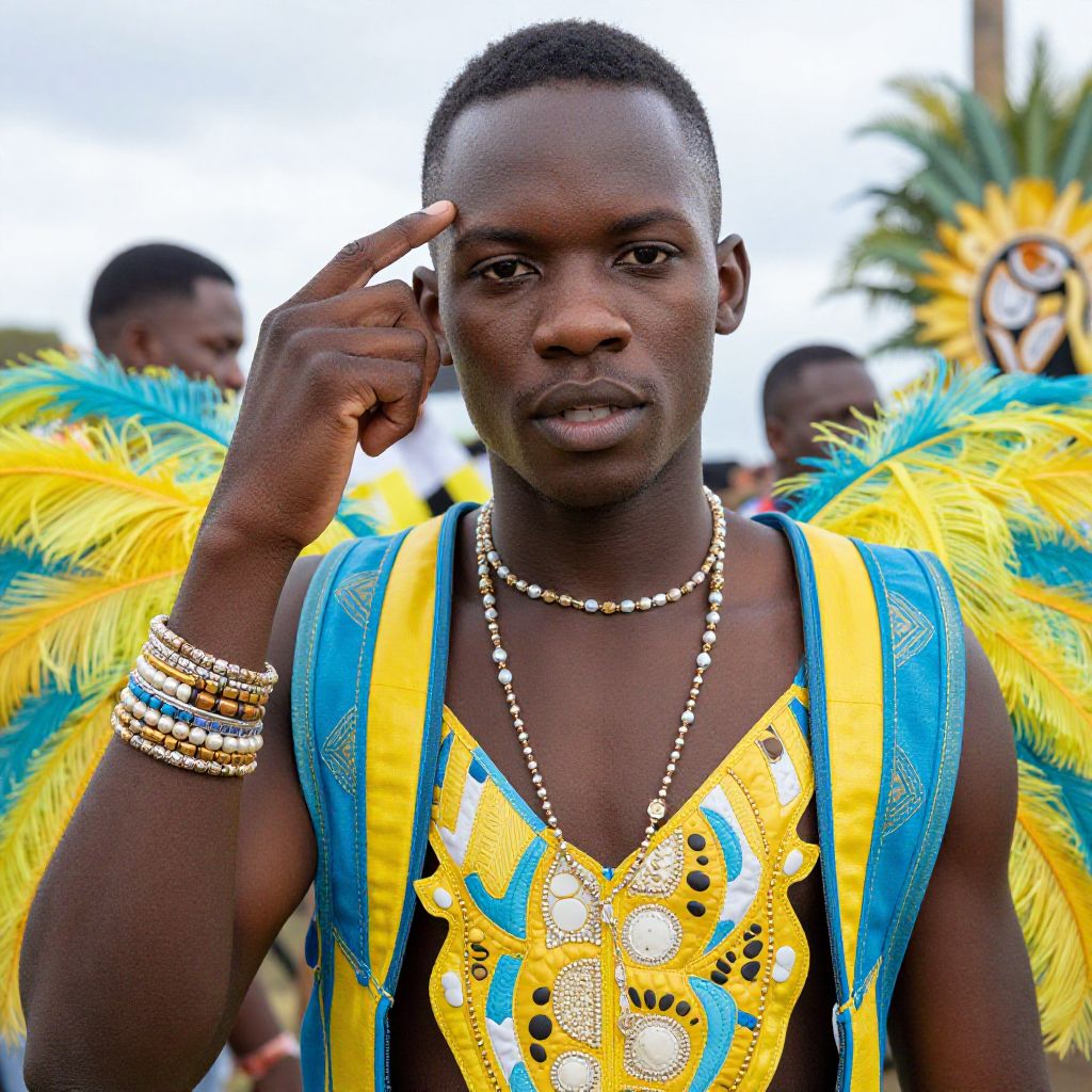 "caribana festival costume, jewelry, dark skin, necklace, 1boy, male focus, solo, bracelet, dark-skinned male, outdoors Realistic photo of casual sexy person with pretty face"