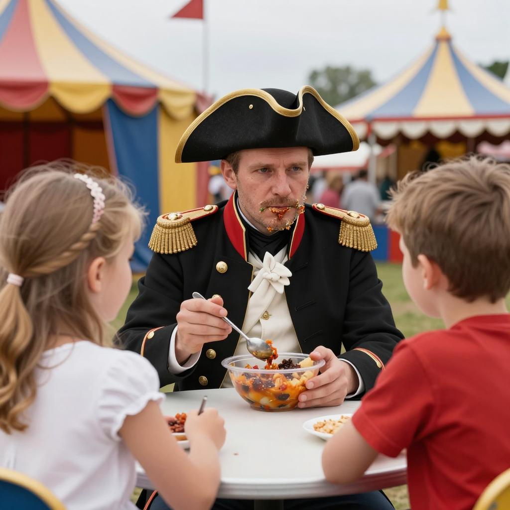 A man in a black tricorn hat and epauletted military-style jacket sits at a table with two children. He has a serious expression, holding a spoon in a clear bowl with food. A blonde girl with a white dress and a boy in a red shirt face him. Background includes colorful carnival tents. The man's face is smeared with food. Three people, carnival setting.