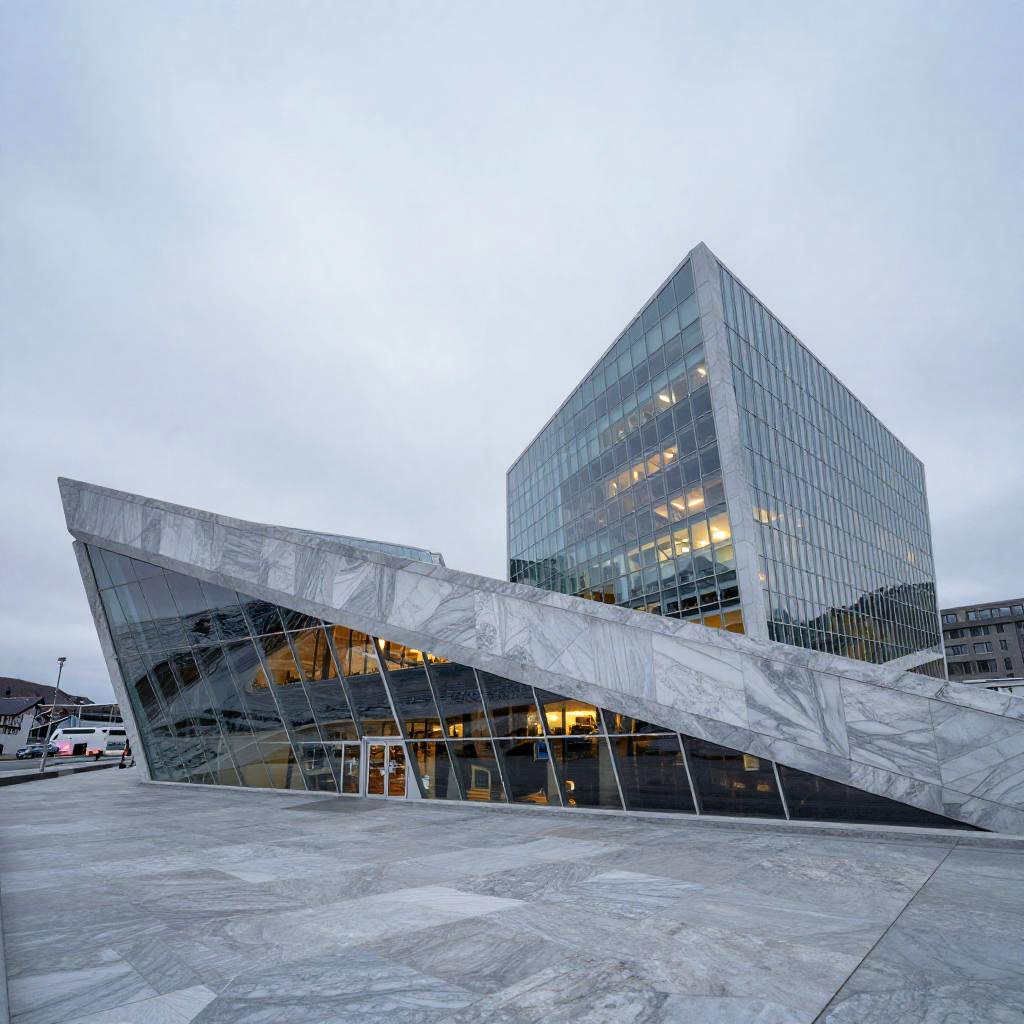 Photograph of modern, angular, glass-wrapped building with large, tilted metallic panels, illuminated windows, and concrete plaza under overcast sky.