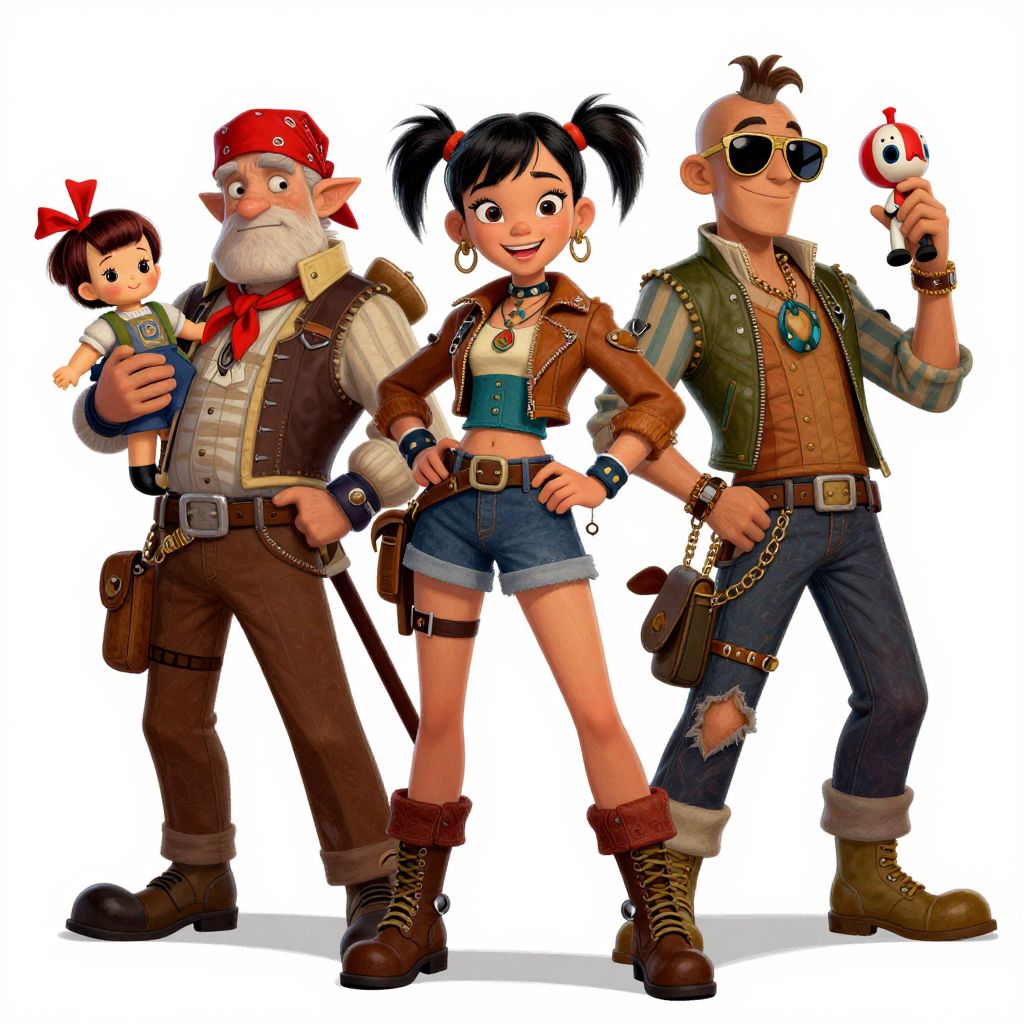 The image is a vibrant and dynamic illustration featuring a group of characters in a Victorian punky style, reminiscent of the 1980s. The central figure is a young girl with pigtails, dressed in a brown jacket and boots, standing confidently in the foreground. To her left, an older man with a rugged appearance and a red bandana on his head is depicted, holding a small doll with a red ribbon in its hair. On the right, a man with a shaved head and sunglasses is shown, holding a toy with a red and white design. The background is a stark white, which accentuates the colorful and detailed characters. The overall composition is balanced, with the characters arranged in a triangular formation, creating a sense of depth and perspective. The illustration is signed by Mike Mignola and Craig Mullins, and it has a Disney-style aesthetic, capturing a sense of adventure and camaraderie among the characters.