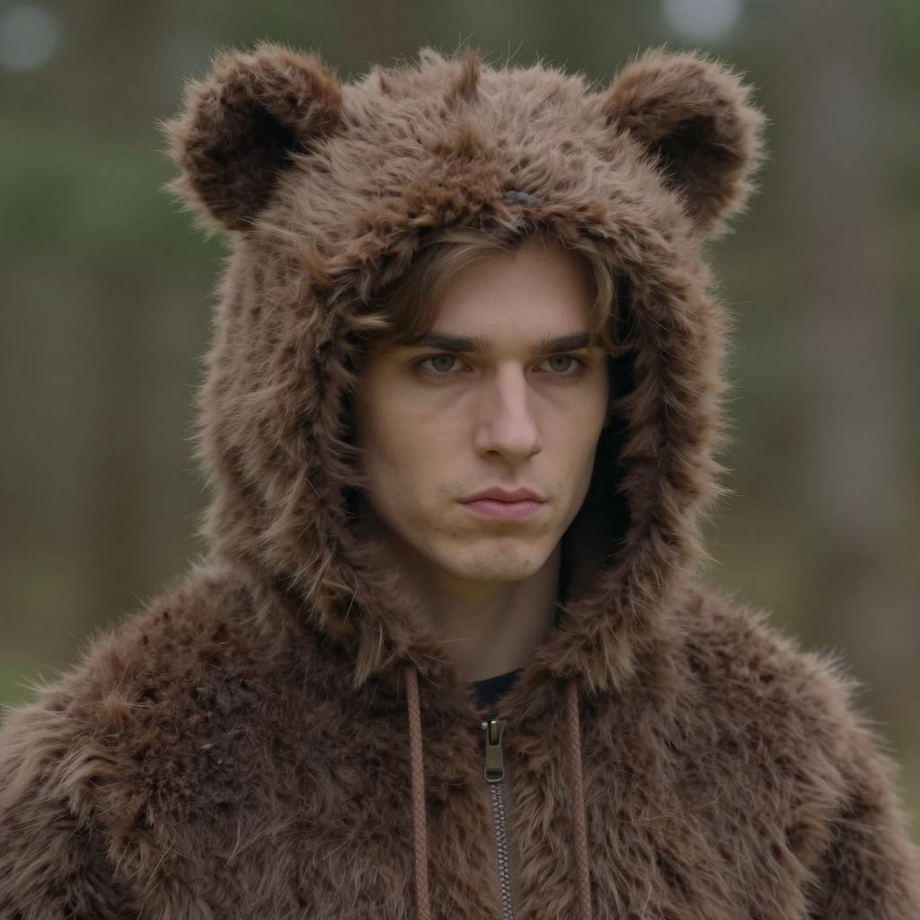 Adult ewok costume, photograph of handsome young man, wearing realistic bear costume with brown fur, bear ears on hood, serious expression, green eyes, light brown hair, blurred forest background, daytime, close-up, neutral lighting, soft shadows, realistic ures, slightly tilted head, costume with drawstrings, natural light, casual, outdoor setting
