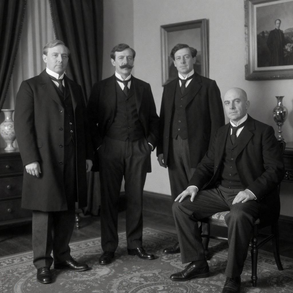 Black-and-white photograph of a group of people ascending a grand staircase. 12 men and women in formal Victorian attire, some with hats. Staircase has ornate balustrade and large statue on the left. People in mid-ascension, some looking at the camera. Intense expressions on faces. Monochromatic, high contrast.