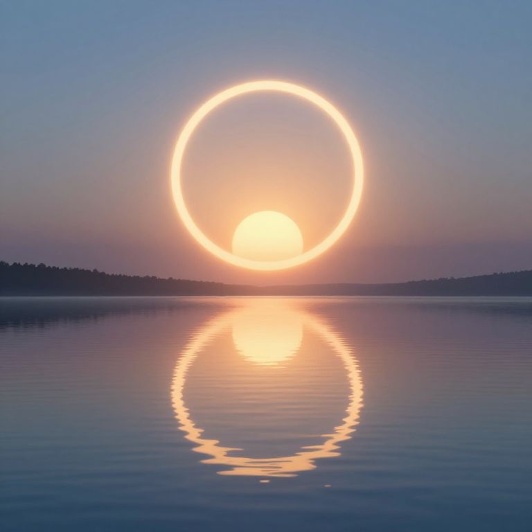 A serene 3D-rendered landscape captures a breathtaking annular solar eclipse, where the sun forms a perfect ring above a tranquil lake, mirrored flawlessly on its glassy surface, evoking a utopian vision that fades into the horizon as dawn approaches.