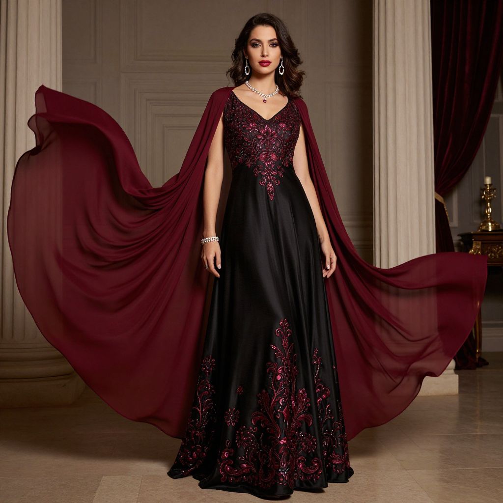 Putfit portraying an elegant evening ensemble, flowing fabrics with rich colors like deep reds and blacks, luxurious indoor setting with soft spotlight, intricate embroidery and accessories, sophisticated and glamorous mood