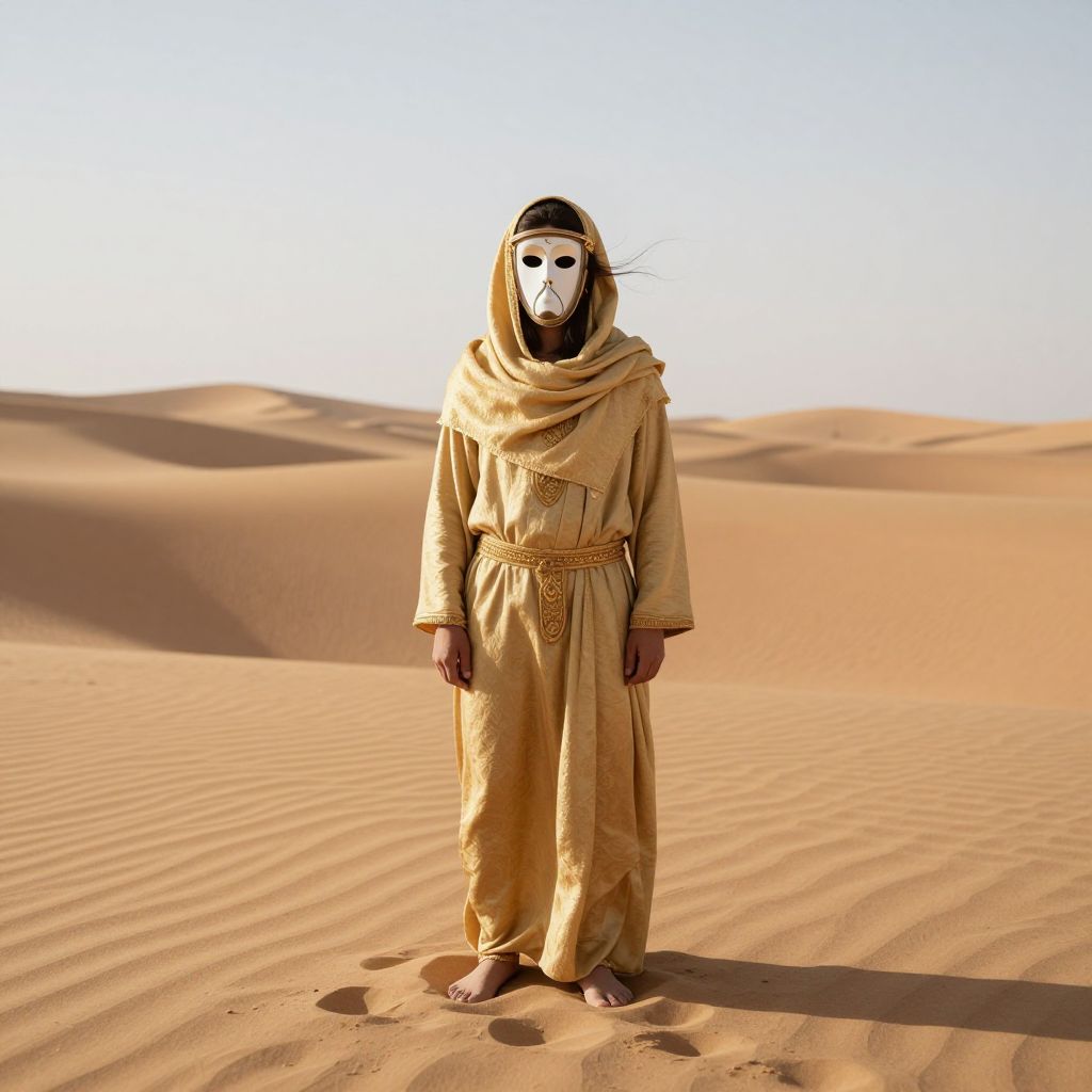 In the vast expanse of the desert, a solitary figure draped in golden sands stands as a paradox of time, their hourglass mask ticking backward, embodying the eternal struggle between the relentless march of time and the human desire to reclaim lost moments, while the whispers of the wind carry the weight of solitude and the infinite yearning for connection.