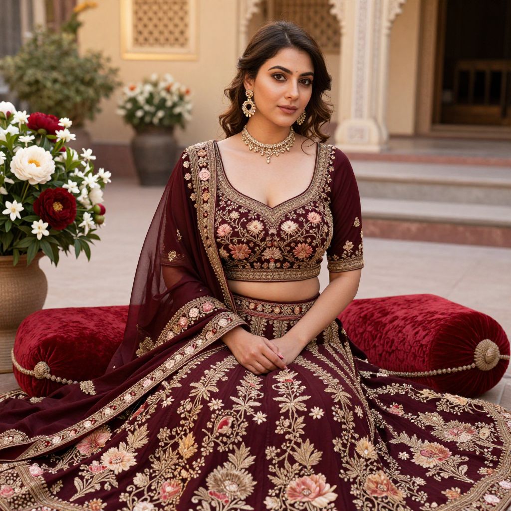 A graceful woman with fair skin, soft brown eyes, and a delicate nose wearing a richly embroidered Gujarati lehenga choli in maroon with floral golden borders, sitting on a red velvet cushion in a traditional haveli courtyard during a temple festival, peonies and jasmine flowers blooming nearby, soft golden hour lighting, detailed fabric texture, authentic cultural setting. The woman has big tits and cute face