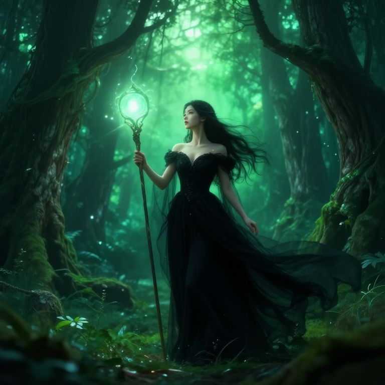 A mystical sorceress stands in an enchanted forest, surrounded by ethereal light and ancient trees. Her flowing black gown contrasts beautifully with the vibrant greens of the woodland, while she holds a staff that emanates a glowing orb. This artwork captures a sense of magic and fantasy, inviting viewers into a world of wonder.