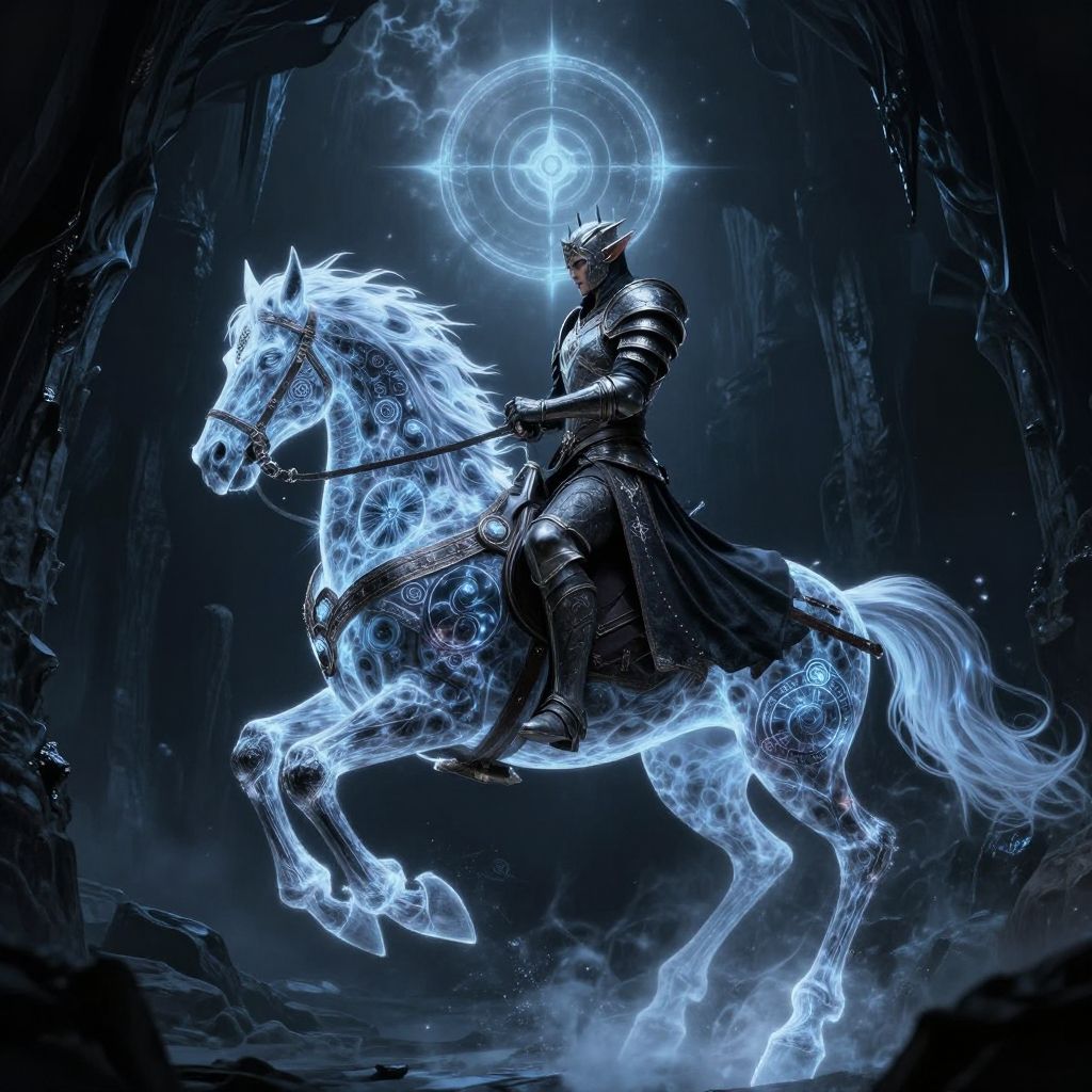 Baldur's Gate 3 drow paladin riding a spectral steed through moonlit caverns, adorned with ethereal dark armor and holy symbols, magical energy swirling around, high detail fantasy scene