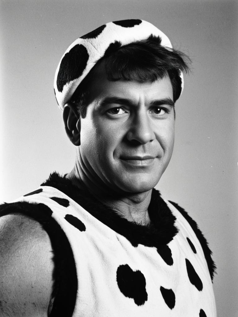Man in Fred Flintstone Costume, photorealistic studio portrait, sharp detail