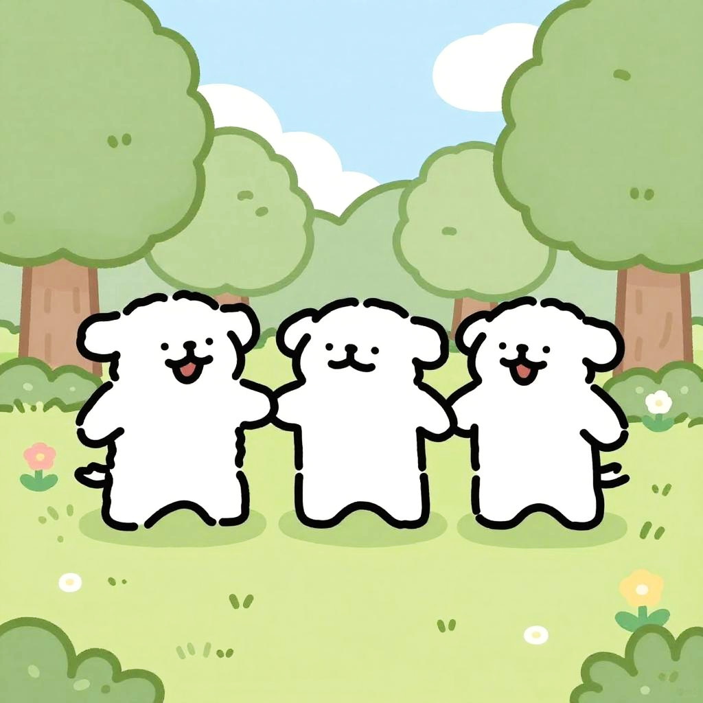 Three stick figures joyfully holding hands, drawn with bold black strokes, set against a sunny park scene with trees and flowers, cartoonish and playful