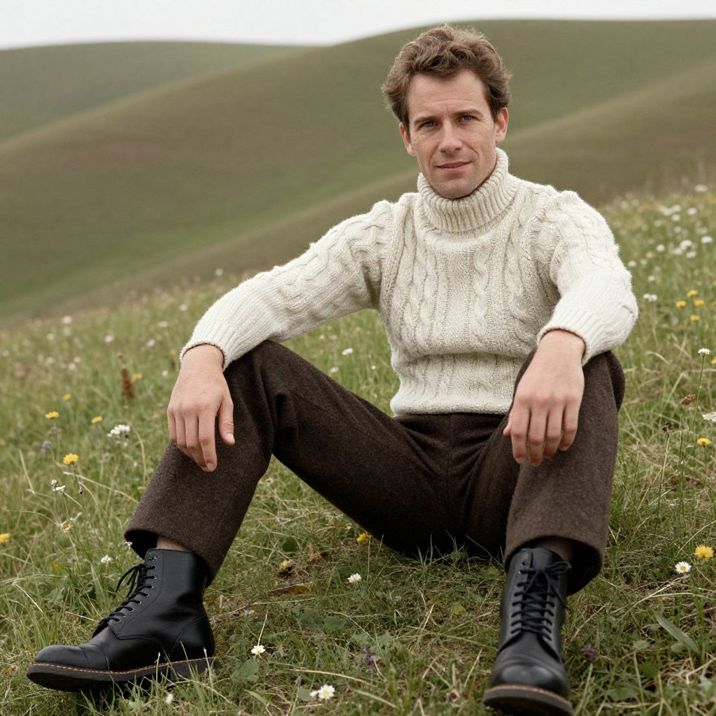 A man, cream cable-knit turtleneck sweater, dark brown wool trousers, black leather lace-up boots, rolling green hills, scattered wildflowers, vintage photo, relaxed smile, earthy tones. Man has masculine face and piercing eyes