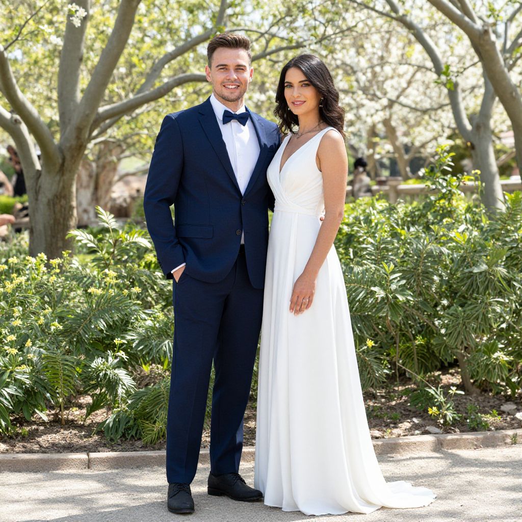 Photograph of a smiling couple standing outdoors on a sunny day. The man, with short brown hair and light skin, wears a black tuxedo with a white dress shirt and black bow tie. The woman, with long dark brown hair and medium skin, wears a sleeveless, white, floor-length gown with a deep V-neck. They stand closely together, with the man's right hand in his pocket and the woman's left hand resting on her hip. The background features lush green foliage with white flowers, and a paved pathway. The lighting is bright, highlighting their elegant attire and joyful expressions.