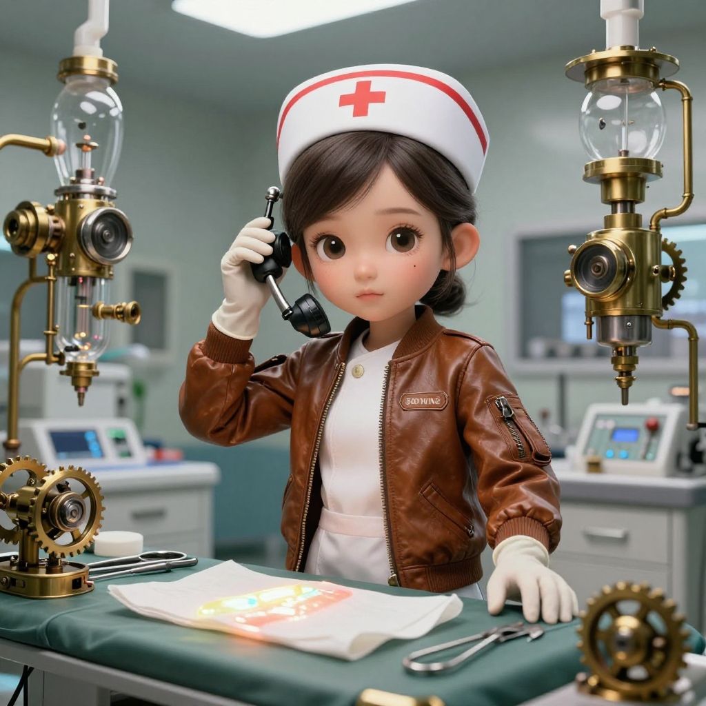 Nurse, nurse cap, latex gloves, stocking, in hospital operating room operating table operating machine medical instruments, (steampunk:1.5) (glass gold silver blass pipe pipeline steam-unit gear mainspring pulley) (mechanical movement fantasy leather metal assembly unit craft headfhone):1.4 (goggles:1.5) plant:1.5 Bomber jacket, kawaii petite minor 1girl 13yo eyeliner skindantation (a mole under the right eye) flat chest (eyes visible through hair) +++, from below, cowboy shot, +++ extremely quality extremely detailed deep-silky-healthy-lackwarm-foundational-soft-skin, illustration high resolution, contrapposto glow shine like opal, UC:realistic cute anime face cinematic angle at the front dynamic pose
