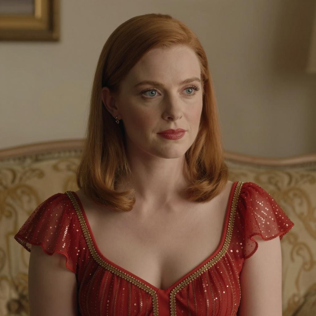Woman with fair skin and shoulder-length auburn hair, wearing a red dress with gold sequins, sits on a beige and gold patterned couch. She has blue eyes, subtle makeup, and red lipstick, wearing small gold earrings. She looks slightly to the right with a calm expression. Background is blurred.