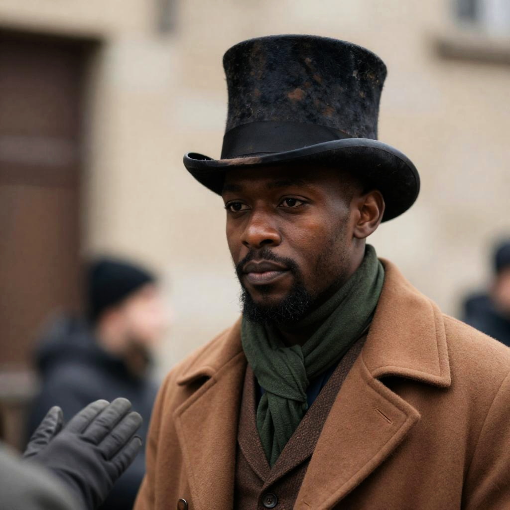 Photograph of a black man with a short beard wearing a tall, worn top hat and brown coat, looking to the side with a neutral expression. He has a green scarf around his neck. Background shows a blurred, rustic building. Another person's hand with a gray glove is partially visible on the left. Blurred person in the background.