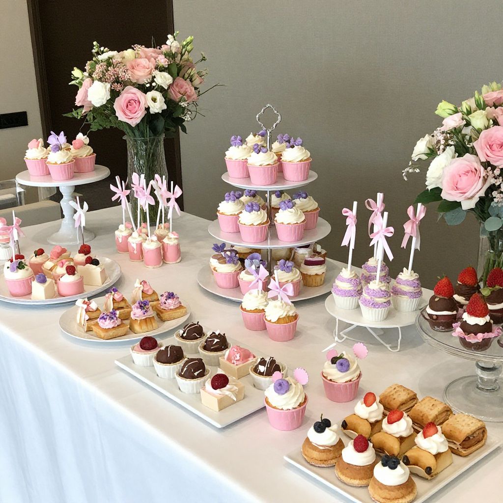 Photograph of a brightly lit dessert table adorned with pink and white cupcakes, each topped with whipped cream, cherry, or chocolate. The cupcakes are decorated with purple and white sprinkles, and many have white paper butterfly flags. The table features tiered stands, smaller plates with assorted pastries, and a floral arrangement with pink roses in the background. The tablecloth is white, and the overall aesthetic is elegant and festive, with a focus on pastel colors and delicate decorations.