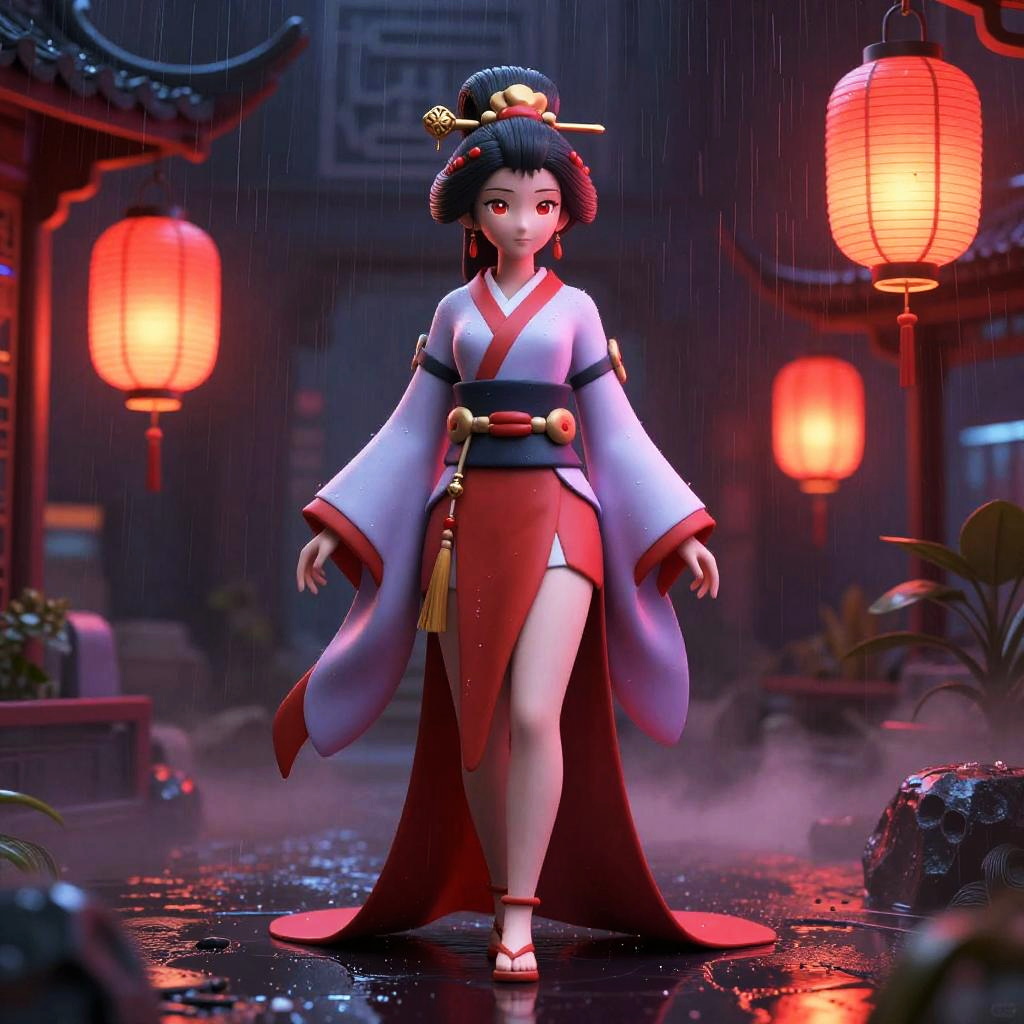 3D android geisha, rendered in a futuristic neon theme within rain-soaked cyberpunk garden with glowing paper lanterns, glowing edges and dynamic reflections, dark abstract background with subtle geometric patterns, high-poly hard-surface detail, calibrated color grading, volumetric fog, rim lighting, soft bloom, global illumination, ambient occlusion, reflective wet floor, ultra sharp microdetail, octane/unreal look, accented by crimson red and pale lavender, depth of field, noise-free finish