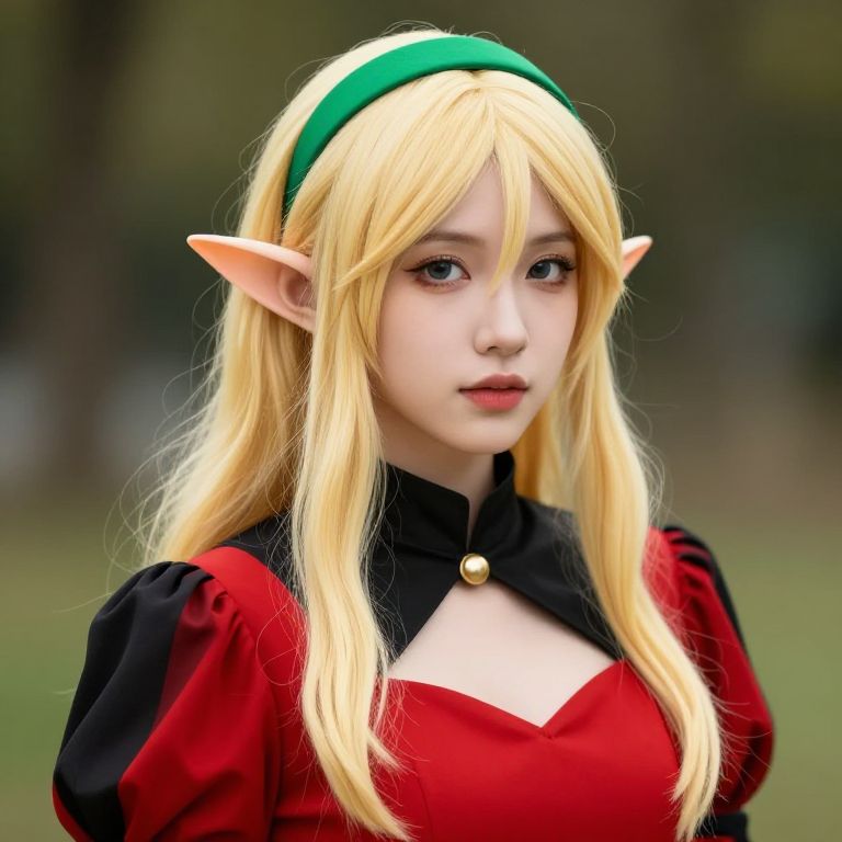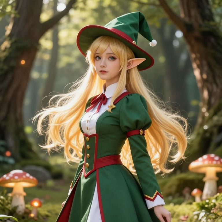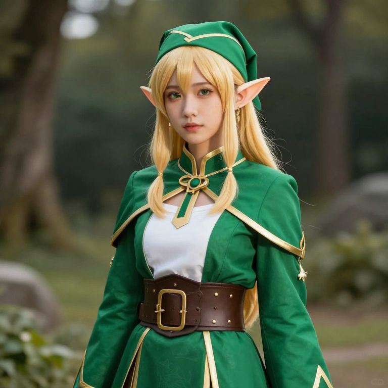 Female elf with blonde hair and blue eyes is wearing a green outfit with gold embroidery and a green hat with a gold design on it.