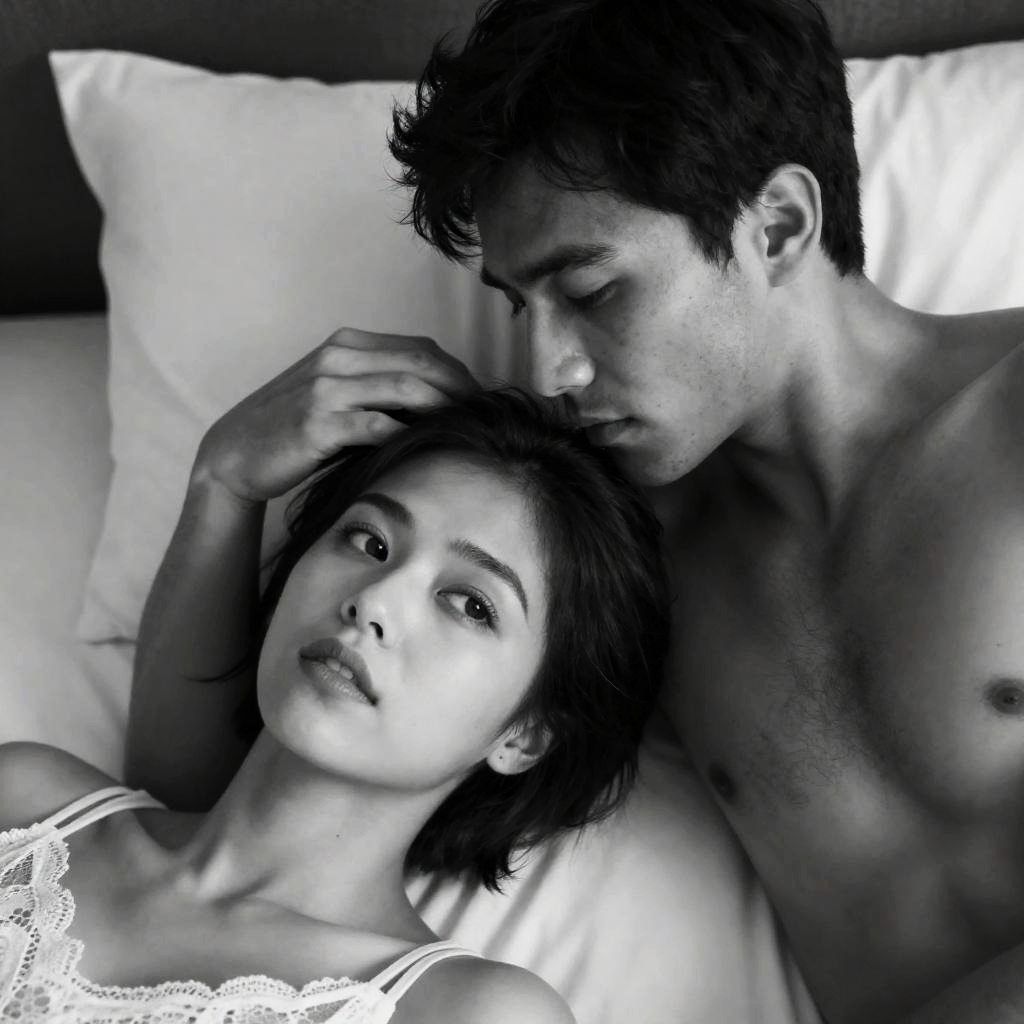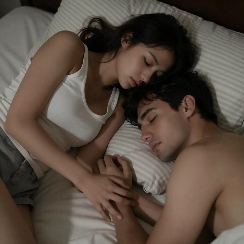 Photograph of a man and woman in bed. Woman with dark hair, white tank top, and visible cleavage, leans over man with short dark hair, shirtless, holding his hand. Low light, shadows, striped pillows, intimate, man's eyes closed, woman's eyes partially open, soft expressions.