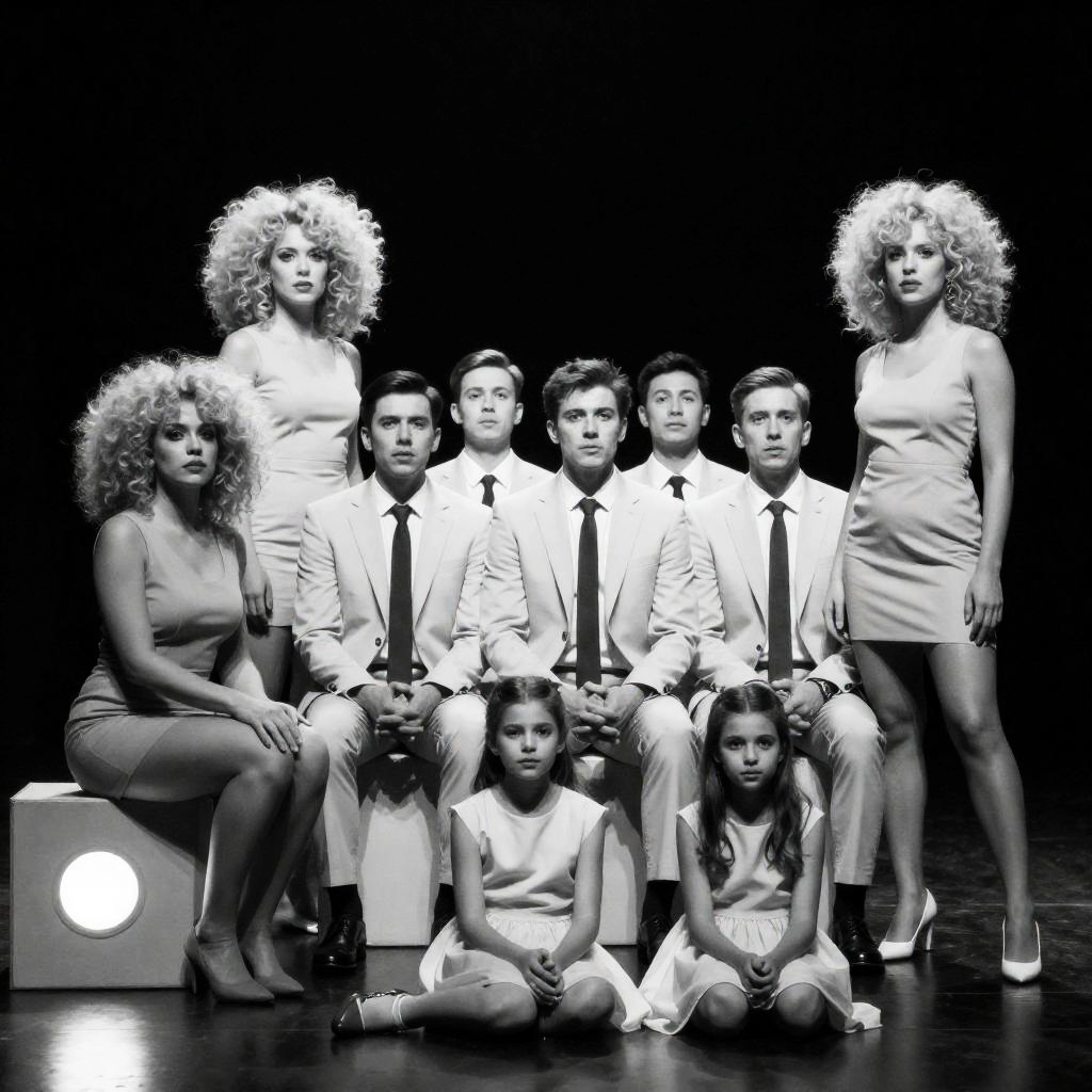 Black and white photograph. Group of people on stage. Four topless women with curly blonde hair in large hairpieces, two sitting on boxes in foreground, two standing on right. Six men in light suits seated in center. Two children in light-colored dresses sitting on floor. Bright lights on boxes. Background dark. Intense expressions.