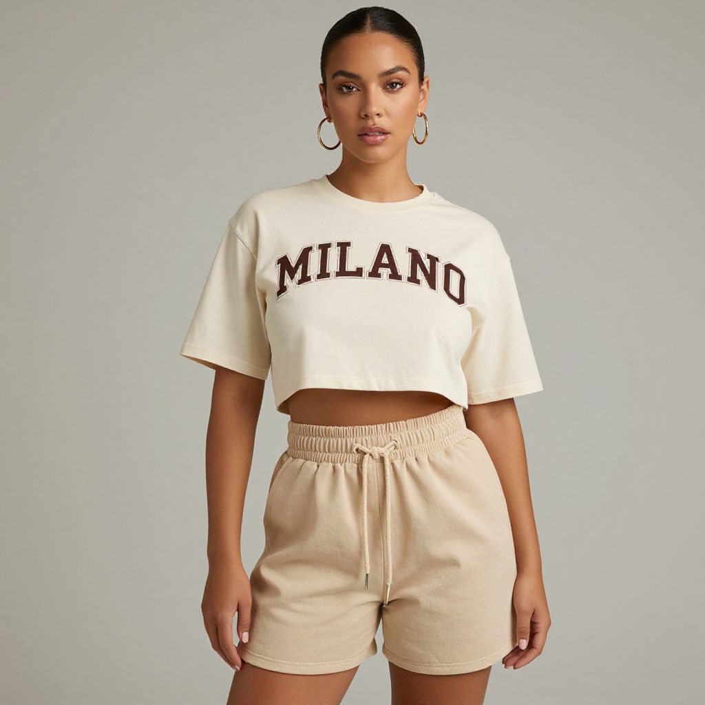 "Woman, streetwear, cropped beige t-shirt with 'MILANO' print in brown, crew neck, short sleeves, high-waisted beige bermuda shorts with drawstring, gold hoop earrings, studio background.. Sexy. Pretty face and beаutiful eyes. Big breasts."