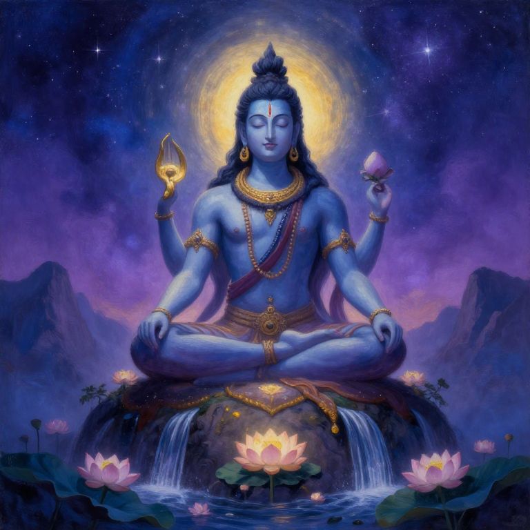 An ethereal painting of Siva meditating on a mountain top under a starlit sky, surrounded by lotus flowers and gentle waterfalls, soft glow around the figure, deep blues and purples blending with warm golden highlights, conveying peace and spiritual transcendence.