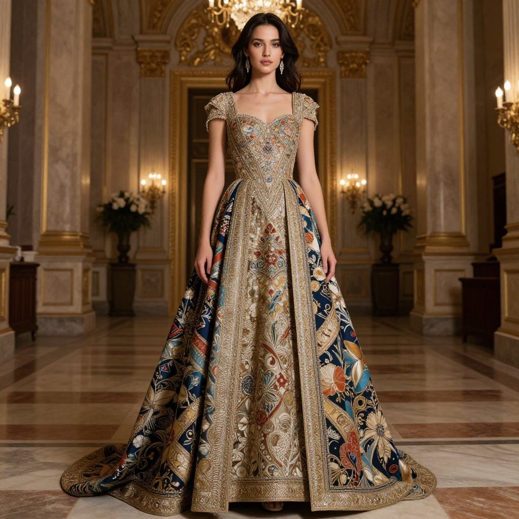 A stunning woman stands elegantly in a grand, opulent setting, wearing an intricately designed gown embellished with ornate patterns and luxurious fabrics. The dramatic architecture and lavish decor provide a perfect backdrop, enhancing the regal vibe of the ensemble.