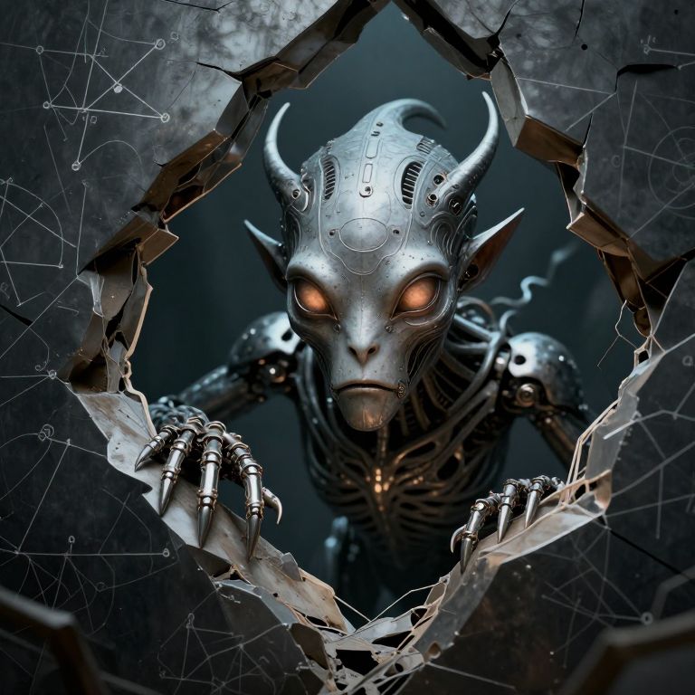 Emerging from the fractured threshold of existence, a creature of mathematical precision and organic mystery navigates the chasm between order and chaos, its piercing gaze and metallic appendages hinting at a silent symphony of problem-solving and existential inquiry.