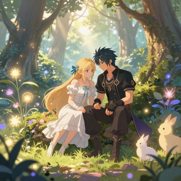 Digital anime-style artwork depicting a blonde, blue-eyed woman in a white, off-shoulder dress with a blue bow, and a dark-haired, brown-eyed man in a black shirt and pants, sitting closely on a forest floor. They are surrounded by glowing flowers and a white rabbit. Sunlight filters through tall trees, casting a magical, ethereal glow. The woman gazes at the man with a gentle expression, while he looks back at her with a soft smile. The scene is lush with greenery and vibrant colors.