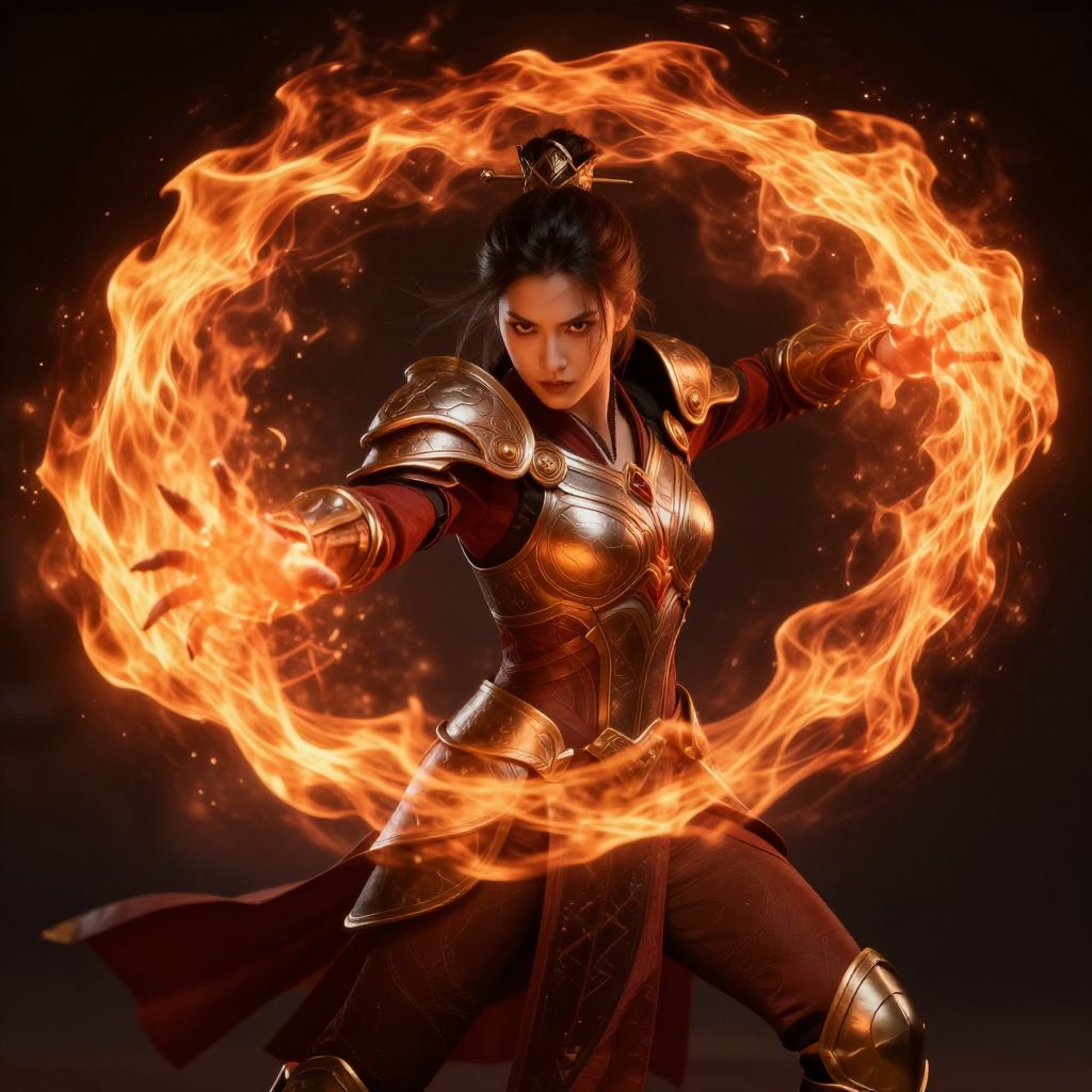 Female magic pose reference, a battle-ready magic caster in mid-motion casting fire magic with flames spiraling from her hands, fierce and determined look, detailed fantasy armor, high contrast lighting, digital art