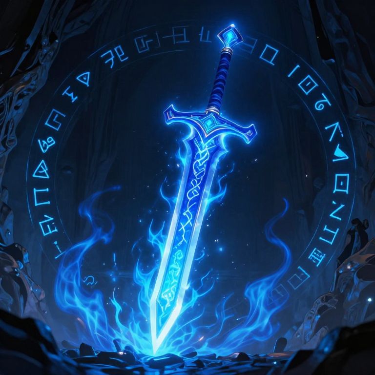 Digital artwork depicting a glowing blue sword with intricate runes etched along its blade, surrounded by vibrant blue flames. The sword, held upright, is centered in a dark, rocky cavern. Luminescent blue runes encircle the sword's upper portion, adding a mystical aura. The background is dark, with subtle textures of rocky surfaces, emphasizing the sword's radiant light. The overall style is fantasy-themed, with a focus on high contrast and ethereal light effects.