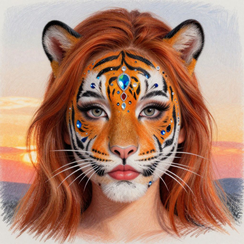 Pastel Pencil Portrait of a young woman, face painted like a tigress, intricate details, face gems, big eyes, long red hair, beautiful lips, unreal sunset,