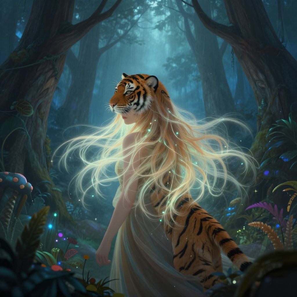 Digital artwork of a female tiger-human hybrid with a strikingly realistic blend. She has orange and white tiger fur with black stripes, blue gem-like markings on her forehead, and piercing green eyes. Her human-like features include long, wavy red hair, full pink lips, and a fair skin tone. The background is a softly blurred sunset with hues of orange, pink, and purple. The style combines hyper-realistic textures with a fantasy concept, emphasizing the detailed fur and human-hybrid face. The overall composition creates a captivating, otherworldly portrait.