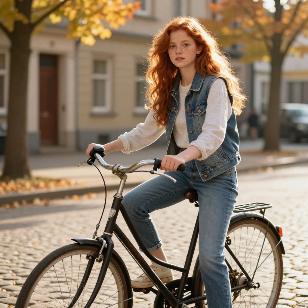 Redhead teen girl sitting by a vintage bicycle on a cobblestone street at golden hour, casual modern clothes, freckles visible, vibrant urban setting with warm sunlight and autumn leaves, photorealistic