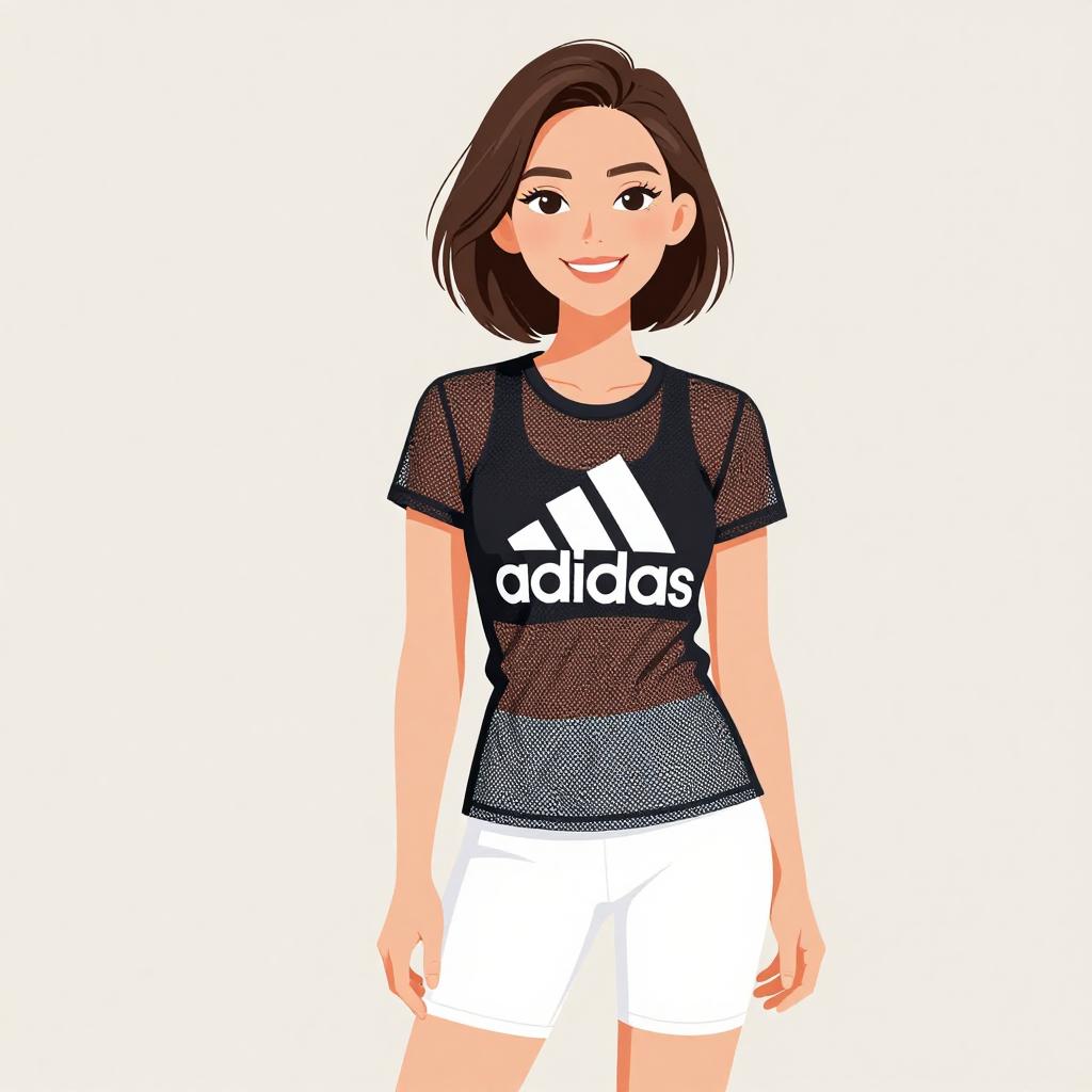 Woman with pretty face and pretty hair. smiling Woman, sporty casual, black mesh t-shirt with a large adidas logo on the front, short sleeves, round neckline, relaxed fit, white bike shorts underneath, solid color, knee-length, simple background with a plain light color. --sref 1467