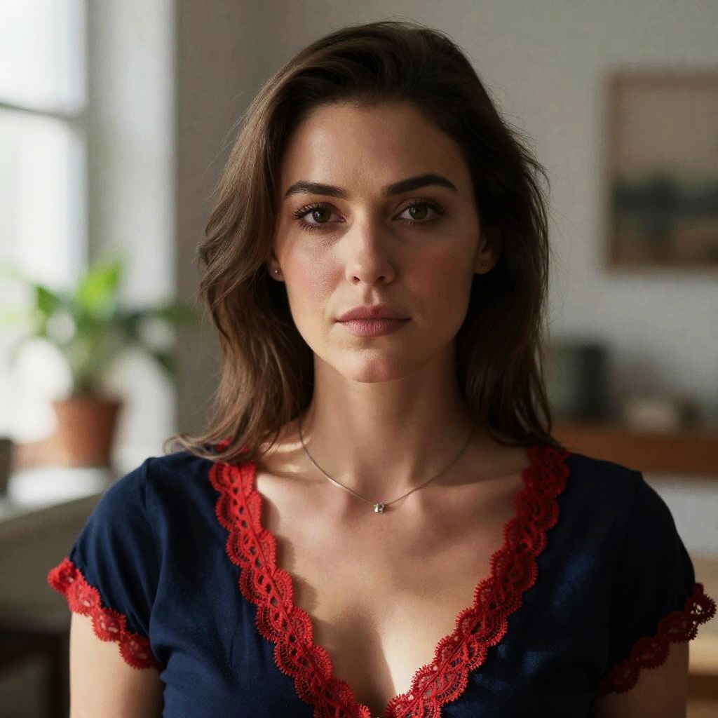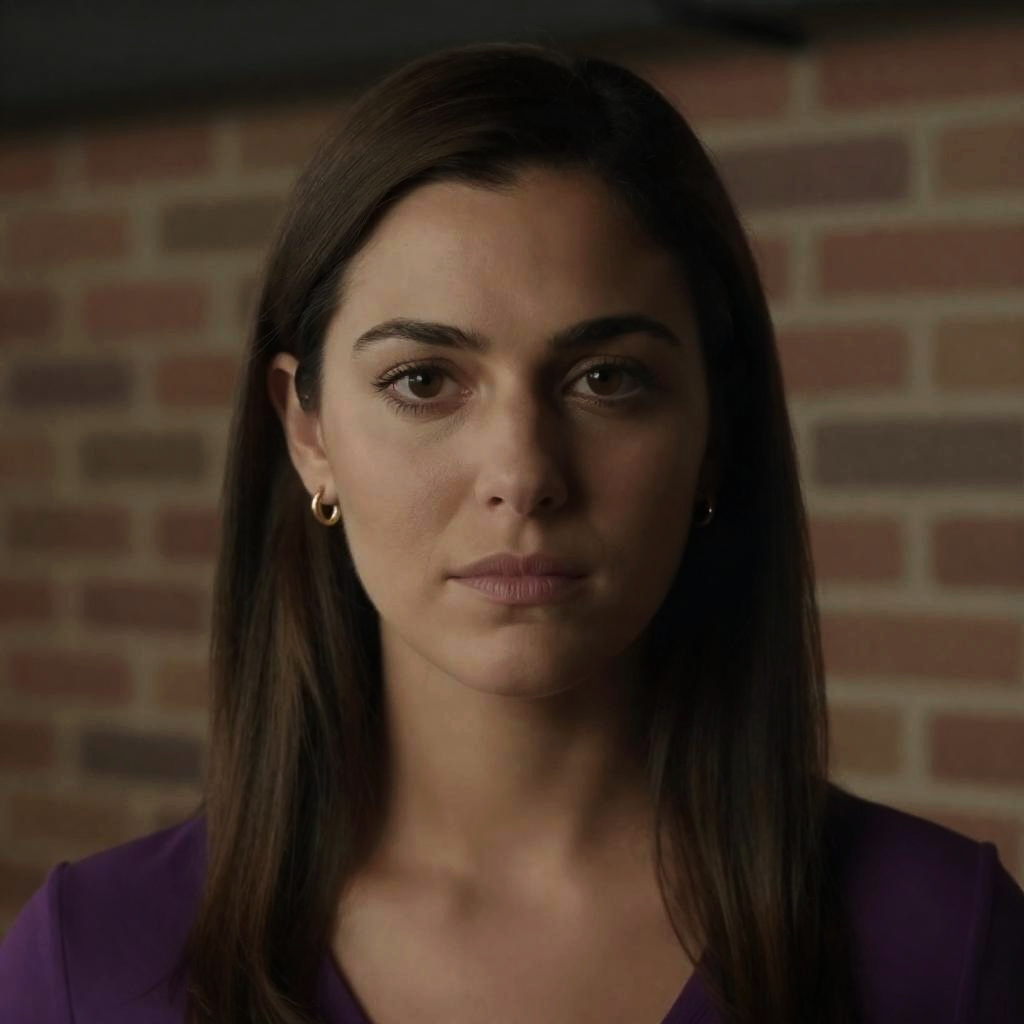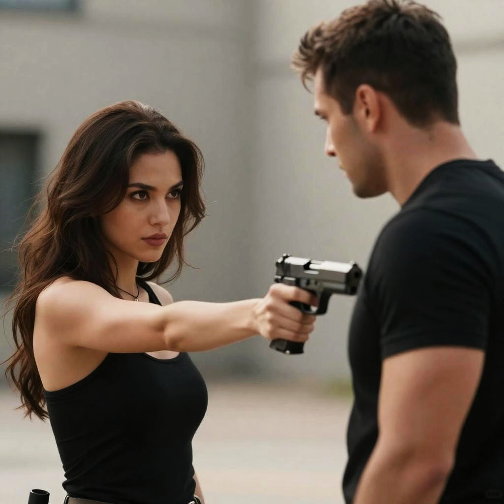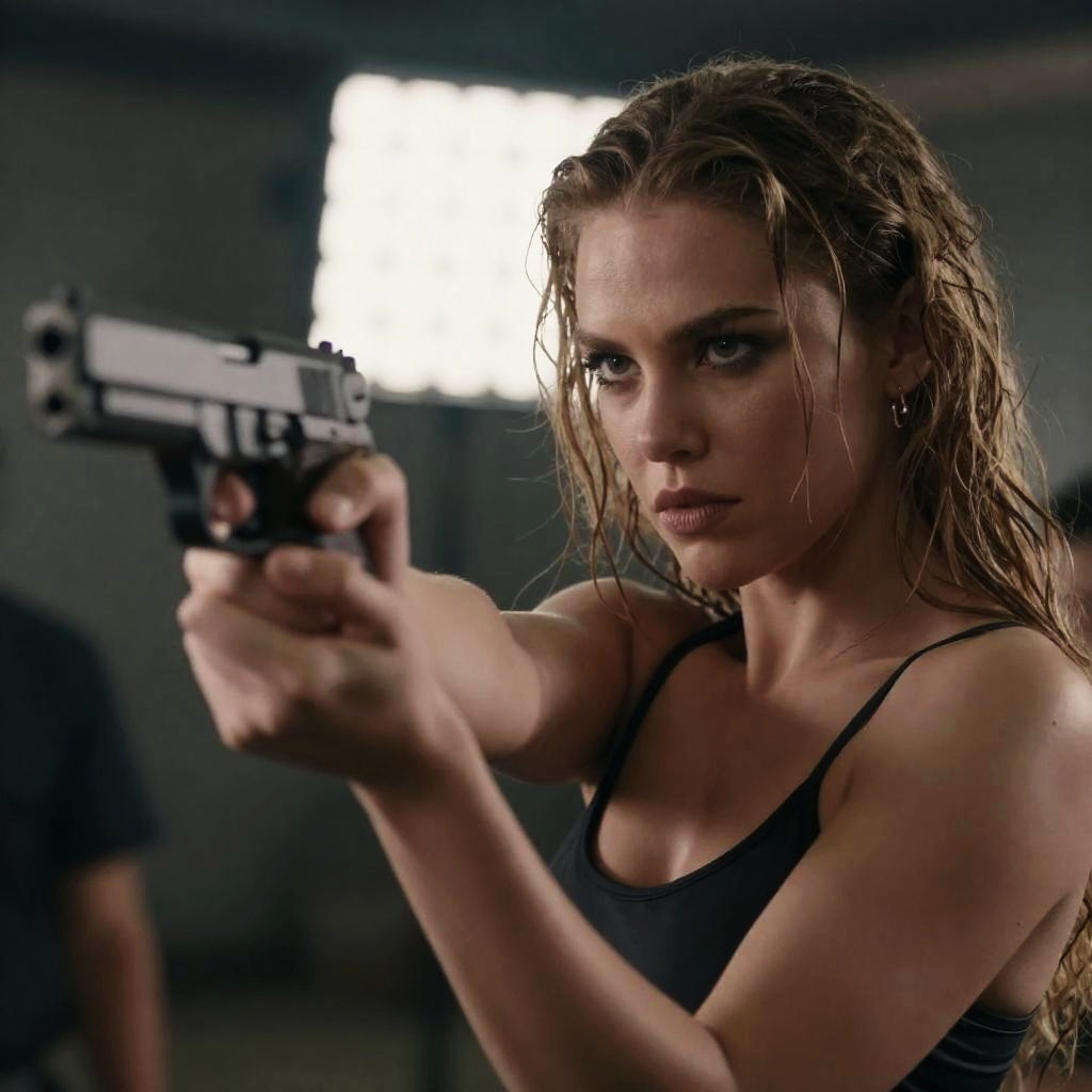 Photograph of a woman with light skin and brown hair in a ponytail, wearing a black tank top and black fingerless gloves. She stands with arms slightly bent, looking serious. Background has two framed pictures on a concrete wall.