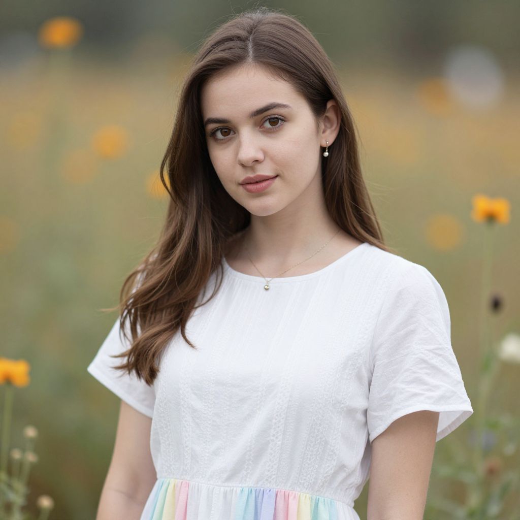 Photograph of a young woman with long, straight brown hair and fair skin, standing in a field of blurred yellow flowers. She has a slender build and wears a white, short-sleeved, slightly loose dress with a subtle rainbow pattern at the waist. She has small, silver hoop earrings and a subtle, natural makeup look. Her expression is gentle and slightly smiling. The background is a soft-focus green field with yellow flowers, creating a serene and natural atmosphere. The lighting is natural, highlighting her face and dress.