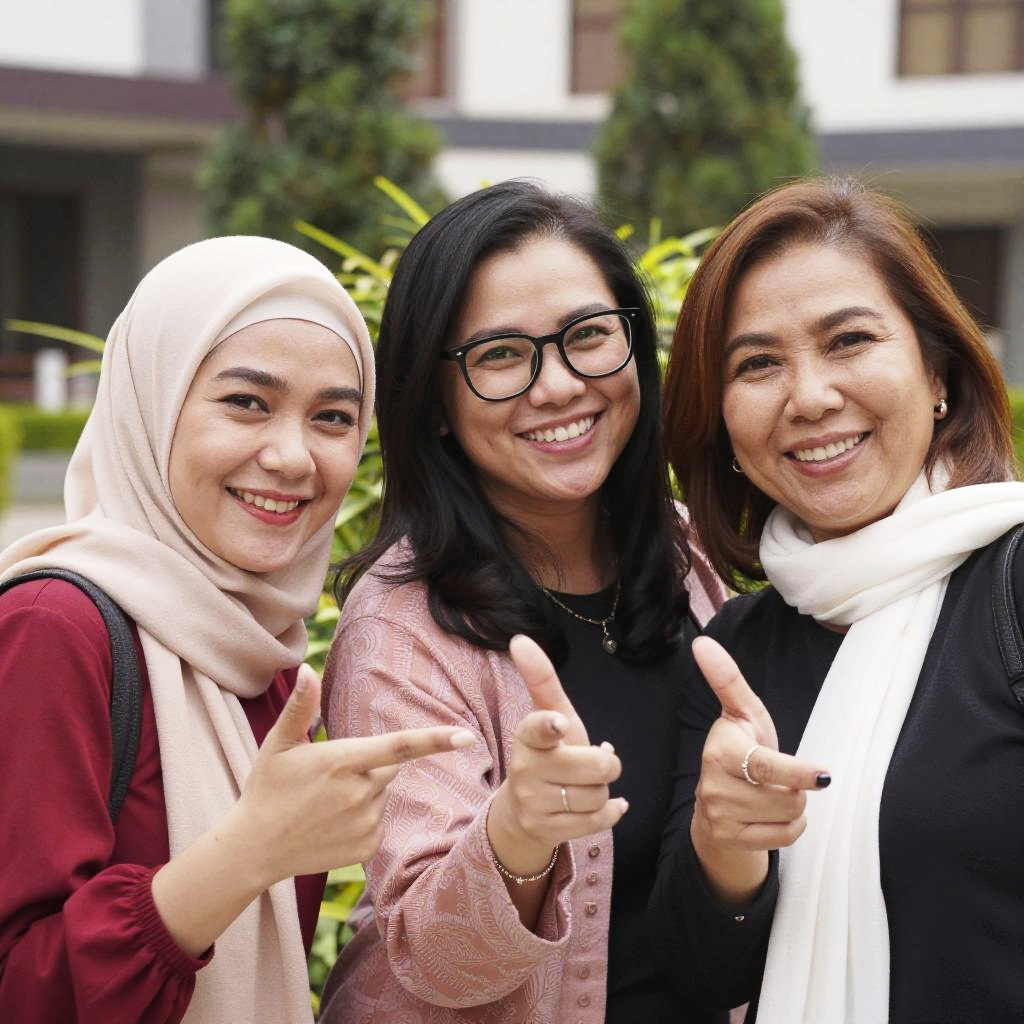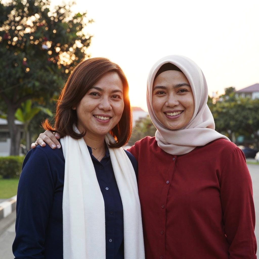 Photograph of two smiling Asian women standing outdoors during sunset. The woman on the left has shoulder-length brown hair, wears a navy blue shirt with a white scarf, and has her arm around the woman on the right. The woman on the right has a light beige hijab, red shirt, and also has her arm around the other woman. Trees and a bright sky form the background.