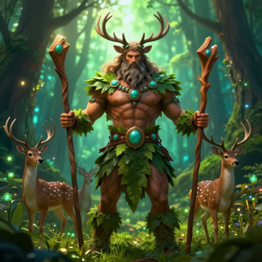 Muscular, bearded, horned forest deity in leafy armor, holding staffs, standing between two deer in a magical, glowing forest.