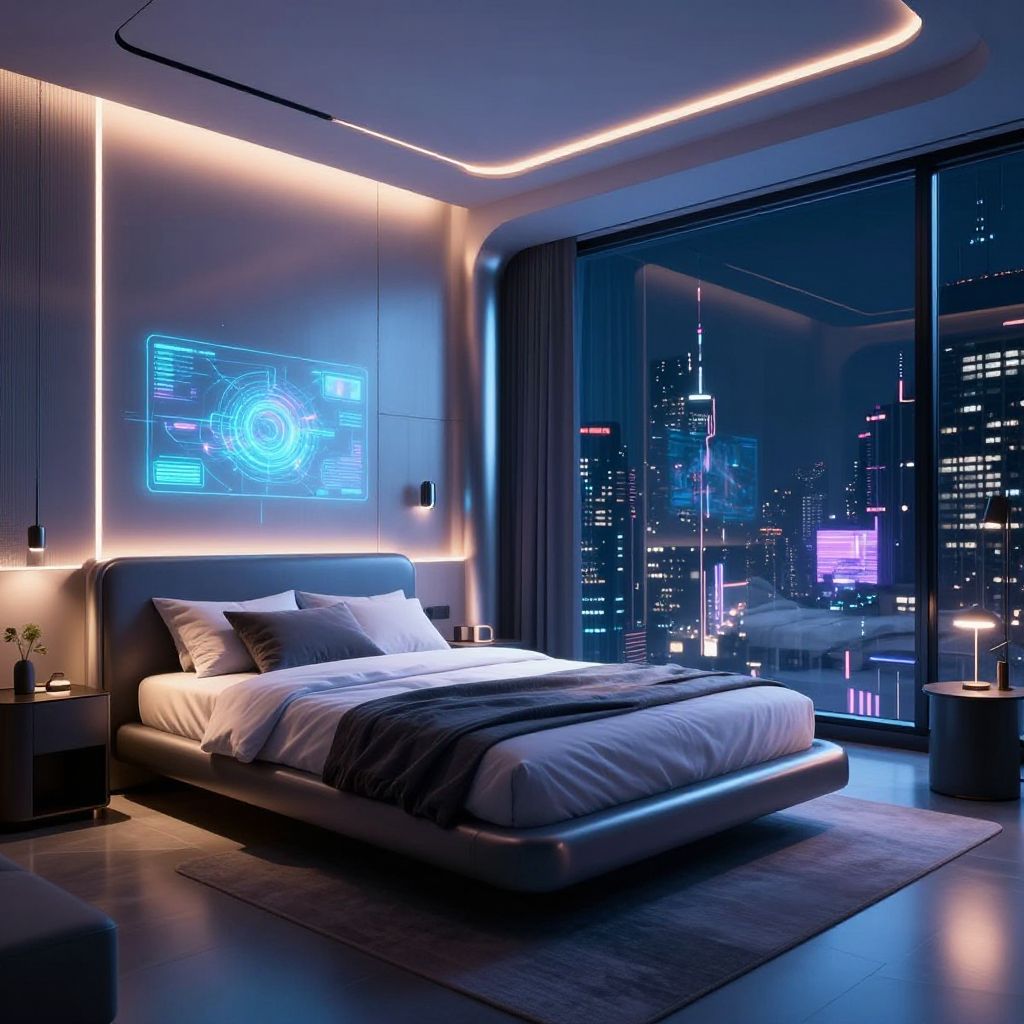 Futuristic bedrooms with sleek metallic surfaces and ambient neon lighting, featuring minimalist furniture, holographic displays, floating beds, large panoramic windows showing a cyberpunk cityscape at night, highly detailed and atmospheric interior design.
