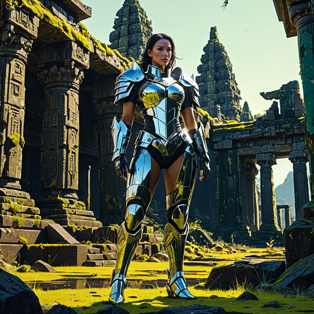 Full body portrait of a futuristic warrior queen wearing polished chrome armor standing in ancient ruined temples covered with vibrant moss. The scene features intricate and elegant details with volumetric lighting highlighting the glistening metal armor against the textured stone ruins. The character exhibits strength and confidence with a backdrop of sharp architectural elements and bright natural colors.