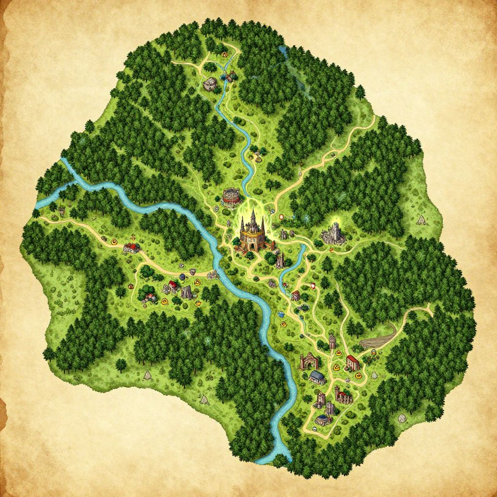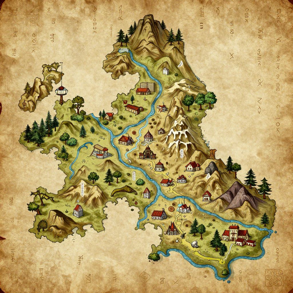 Make a fake map of an ancient fantasy kingdom with intricate mountain ranges, winding rivers, hidden forests, and whimsical village icons, hand-drawn style with aged parchment background, rich earth tones, and mysterious runes scattered throughout the borders.