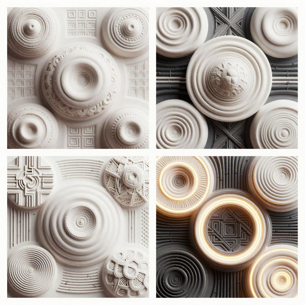 This is a digital art collage featuring four close-up, highly detailed, abstract sections. Each section showcases intricate, 3D, geometric patterns and shapes in shades of white, grey, and black. The patterns include circular designs, linear patterns, and complex interlocking forms, with some sections highlighted by bright white and glowing yellow light, creating a dynamic contrast. The textures are sharp and detailed, giving a sense of depth and complexity.