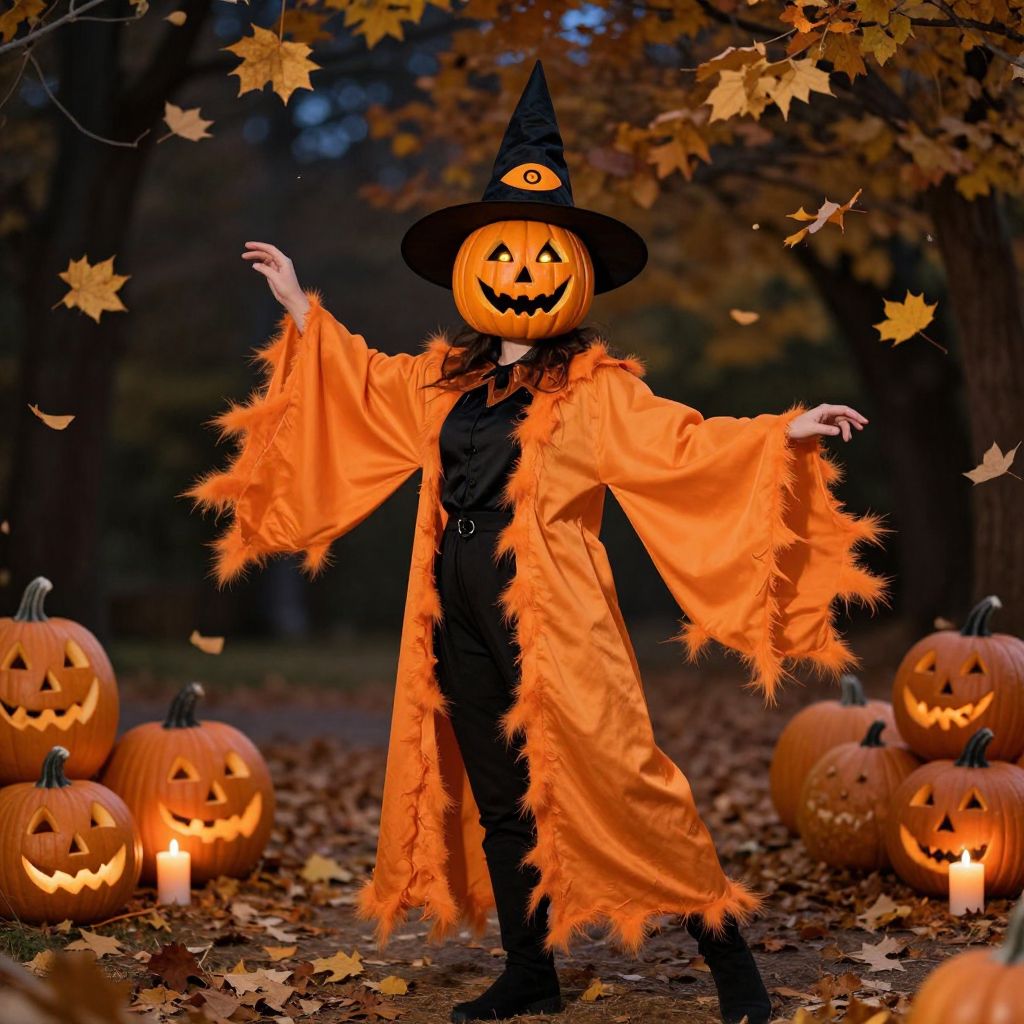 A person is wearing a vibrant Halloween costume featuring rich orange and black colors, with a detailed design including a lifelike jack-o'-lantern face mask, a tattered orange robe that flows dynamically in the wind, and black accessories such as a pointed witch's hat with a glowing orange eye motif, and glowing orange eyes that shimmer with a subtle inner light. The person stands confidently and gracefully in a festive outdoor setting during autumn evening, surrounded by rows of carved pumpkins, flickering candlelight casting warm shadows, and golden autumn leaves drifting gently in the breeze. The atmosphere is lively, joyful, and full of holiday magic, with soft warm lighting and a sense of celebration. The person's expression is bright and engaging, radiating enthusiasm and charm, perfectly capturing the spirit of Halloween in a natural, inviting outdoor environment.