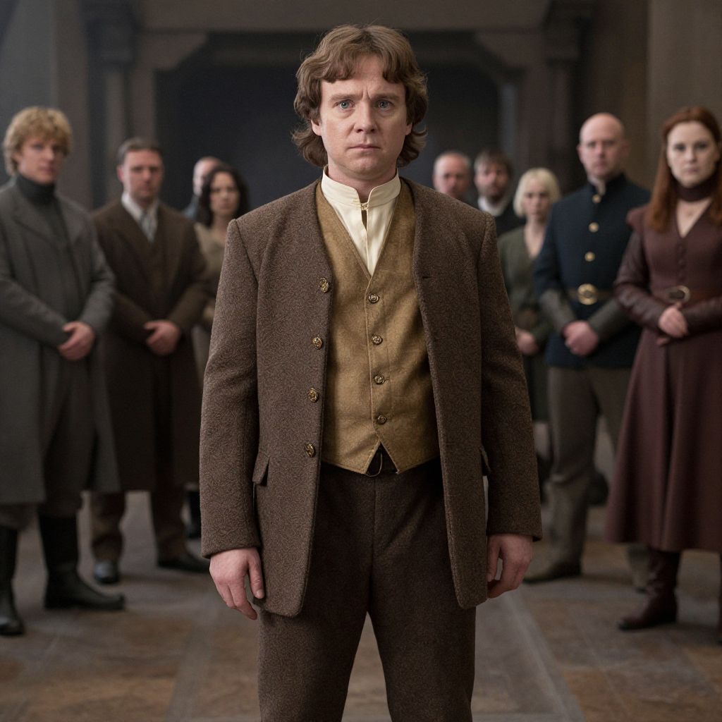 Lotr Frodo Costume, a man in a brown outfit standing in a room with a bunch of people