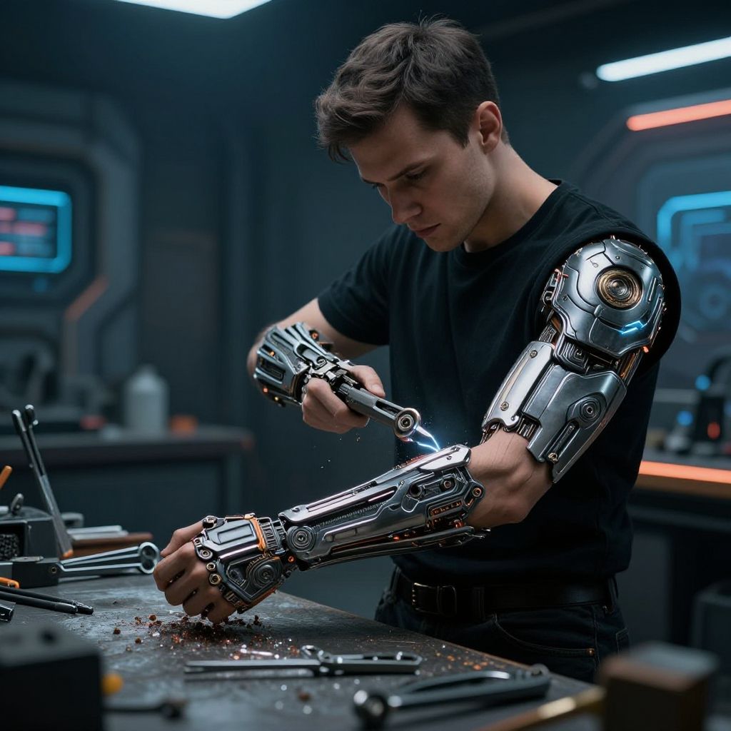 A CGI photograph depicts a young man with short brown hair, wearing a black t-shirt, standing in a futuristic workshop. His right arm is a shiny, metallic cybernetic prosthetic, which he is meticulously adjusting with his left hand. The workshop is dimly lit with blue and orange neon lights, and various tools and gadgets are scattered on a cluttered workbench. The background includes blurred, high-tech control panels. The image has a sci-fi aesthetic, with a focus on the contrast between the man's organic left arm and the sleek, robotic right arm.