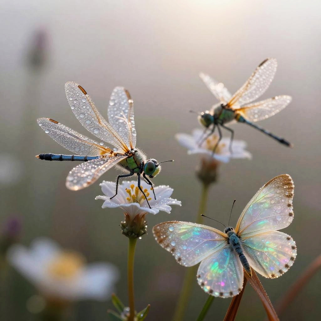Celestial opaline misty wetlands at dawn, endearing miniature dew-kissed dragonflies with opal wings prancing among petals, a butterfly in the foreground formed from netting of pale opal threads, dewdrops glitter, intricate textures, iridescent colors, macro realism, magical realism, hyperrealistic, volumetric light, soft bokeh, tactile details, storybook yet believable, 8k clarity
