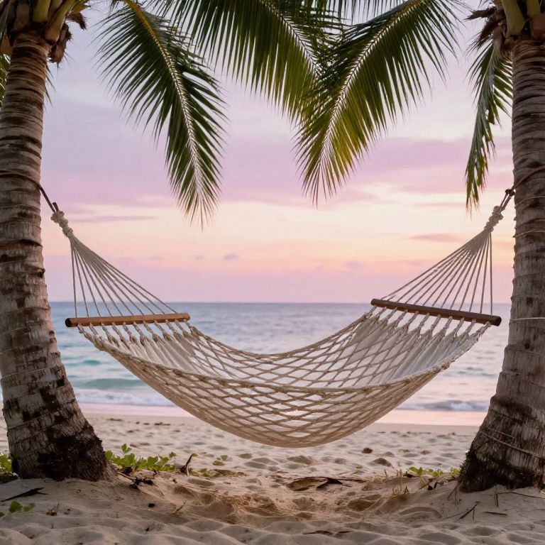 Woven hammock suspended between two palm trees on a sandy tropical beach with pastel-colored sunset sky and calm ocean in the background. The soft breeze subtly moves the hammock's woven rope texture, creating a peaceful and relaxing atmosphere perfect for an idyllic vacation.