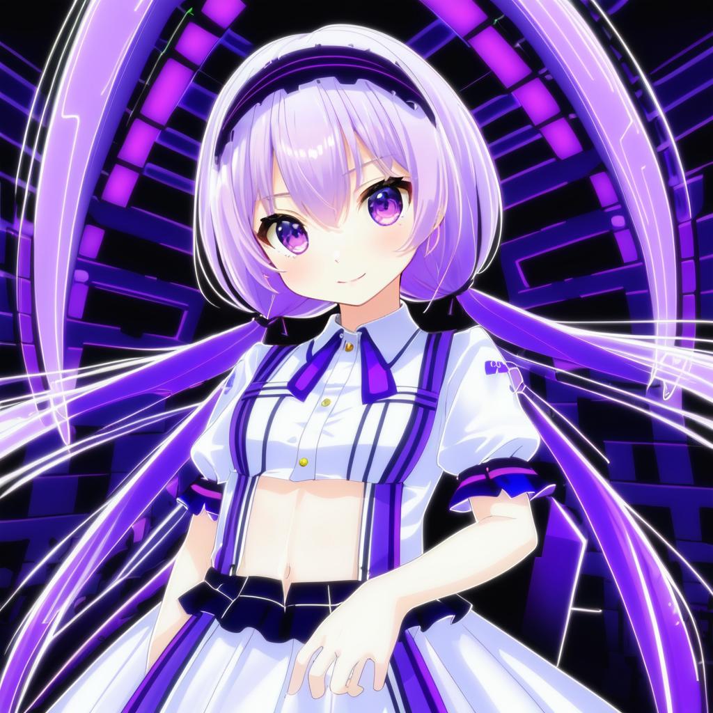 Digital anime-style illustration of a virtual YouTuber girl with long purple low twintails, purple eyes, and pale skin. She wears a white and purple outfit featuring a cropped shirt with suspenders, a skirt with frills, and a headband. The background includes a futuristic, computer-like design with glowing purple accents.